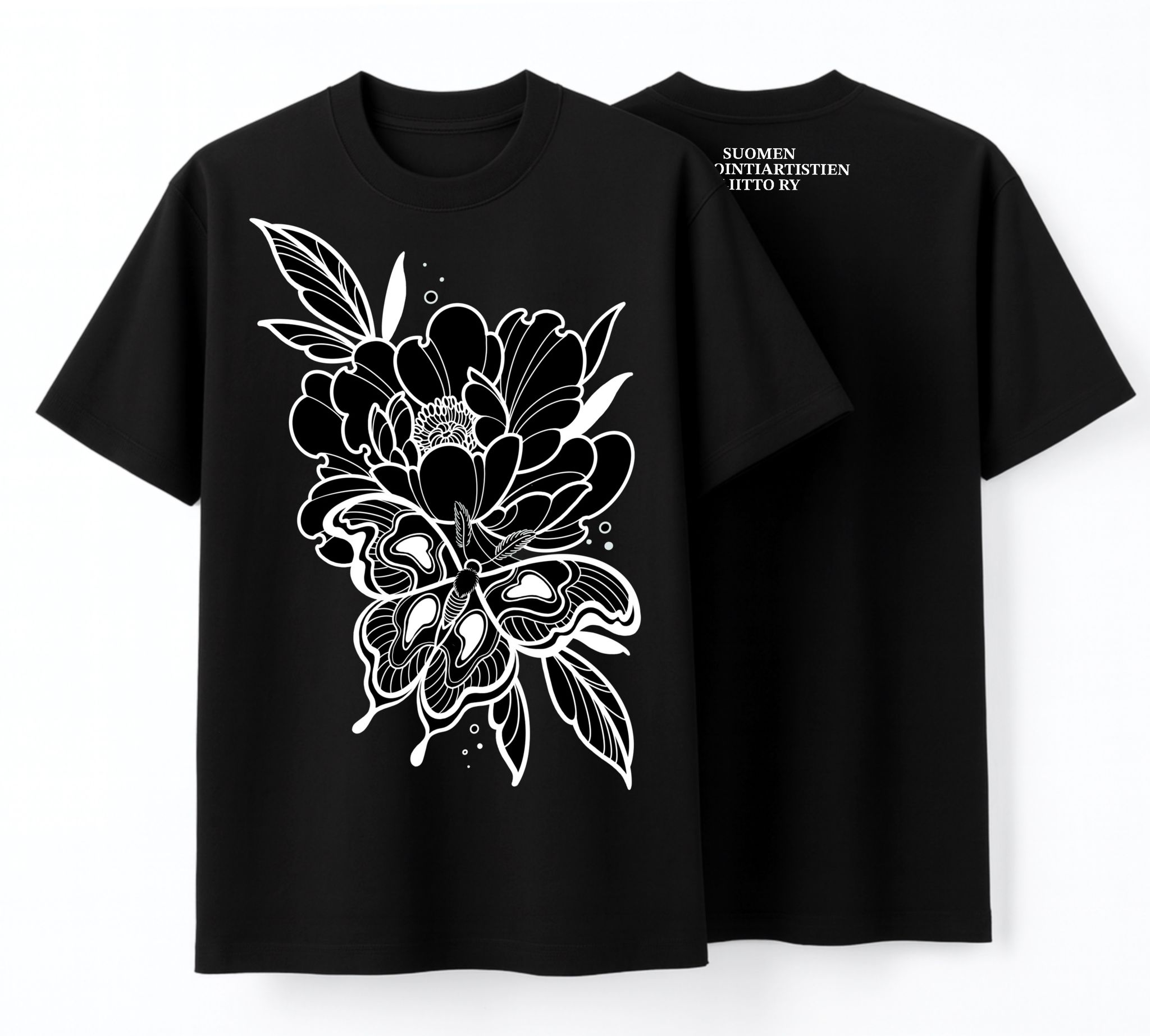 Esikatselukuvat ovat suuntaa antavia. Paidoissa on kuva edessä ja niskassa teksti ”Suomen Tatuointiartistien Liitto ry”